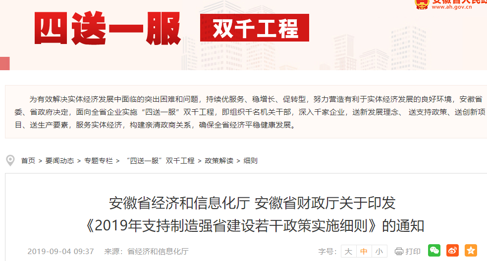 安徽省印發《關于印發支持制造強省建設若干政策的通知》,對獲得國家智能制造試點示范項目的企業給予一次性獎補200萬元。 此外,經省認定的智能工廠、數字化車間,分別給予企業一次性獎補100萬元、50萬元;對通過國家信息化和工業化融合管理體系標準評定的企業給予一次性獎補50萬元;對年度購置10臺及以上工業機器人(自由度≥4)的企業,按購置金額的20%給予一次性獎補。